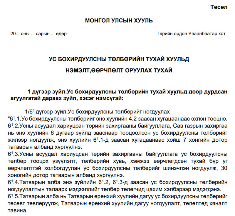 Ус бохирдуулсны төлбөрийн тухай хуулийн нэмэлт, өөрчлөлтийн төсөлд саналаа өгнө үү.